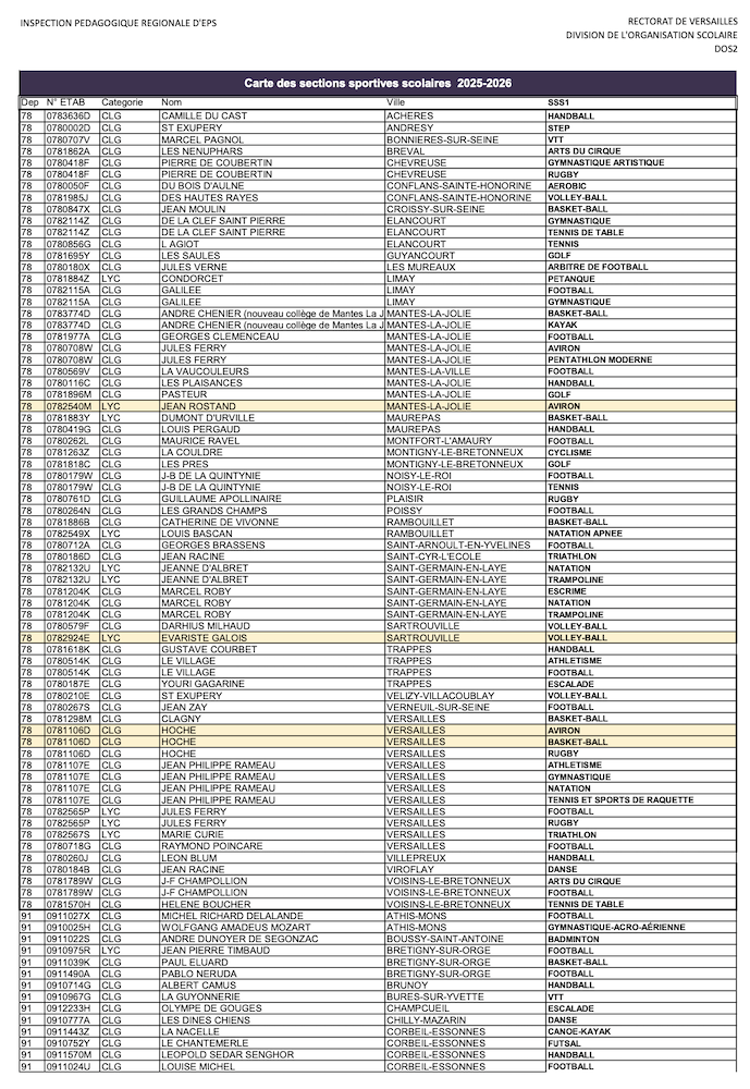 La carte des SSS (Sections Sportives Scolaires) de l’Académie de Versailles pour la rentrée 25-26 a été officialisée.